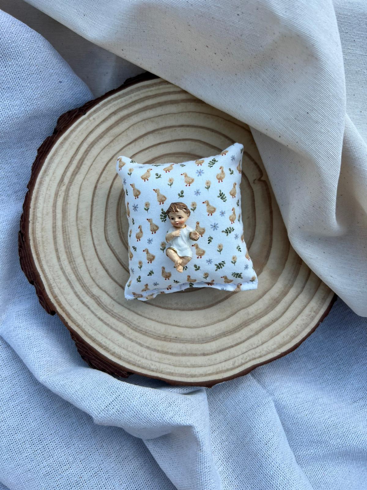 Patitos es la ternura hecha almohadita. Un Niño Jesús entre una tela que bien podría ser un papel pintado de una habitación infantil.
