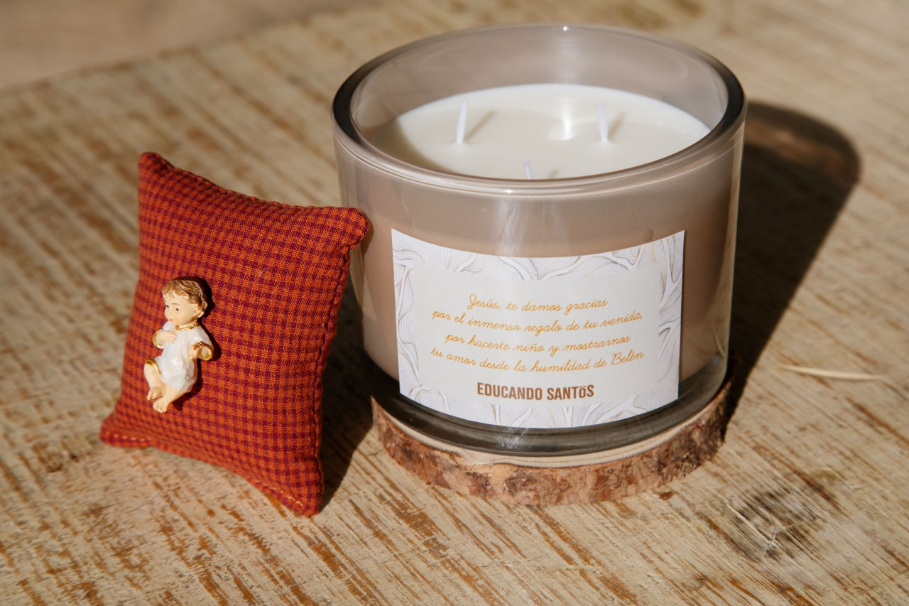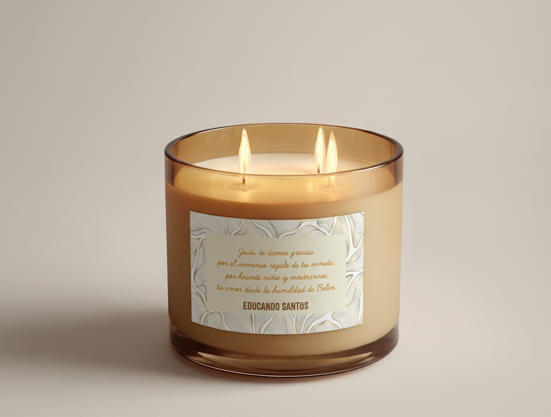 Más que un objeto decorativo, esta vela es un faro espiritual y de oración. Decorada con una tierna imagen del Niño Jesús y nuestra frase inspiradora, es un recordatorio de que Dios se hizo pequeño para que podamos abrazarle sin miedo.